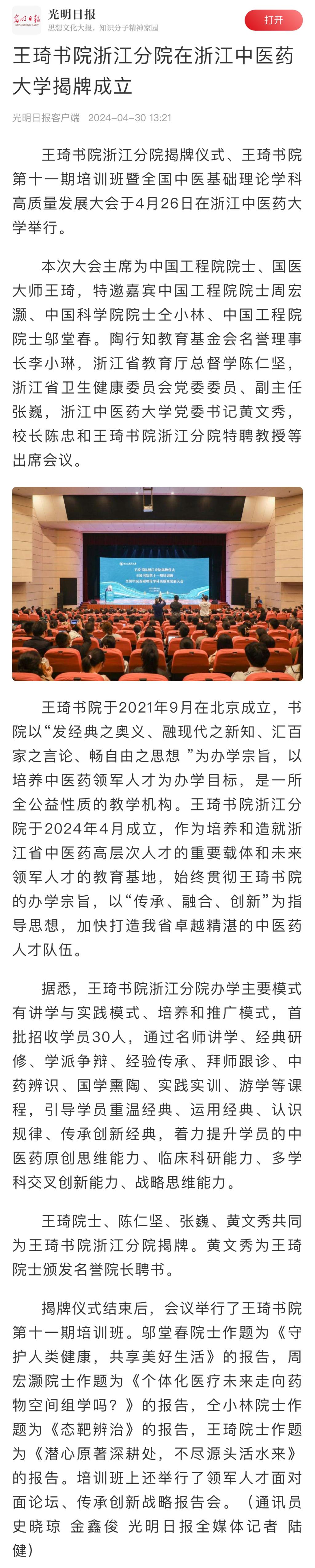 王琦书院于2021年9月在北京成立,书院以“发经典之奥义、融现代之新知、汇百家之言论、畅自由之思想 ”为办学宗旨,以培养中医药领军人才为办学目标,是一所全公益性质的教学机构。王琦书院浙江分院于2024年4月成立,作为培养和造就浙江省中医药高层次人才的重要载体和未来领军人才的教育基地,始终贯彻王琦书院的办学宗旨,以“传承、融合、创新”为指导思想,加快打造我省卓越精湛的中医药人才队伍。