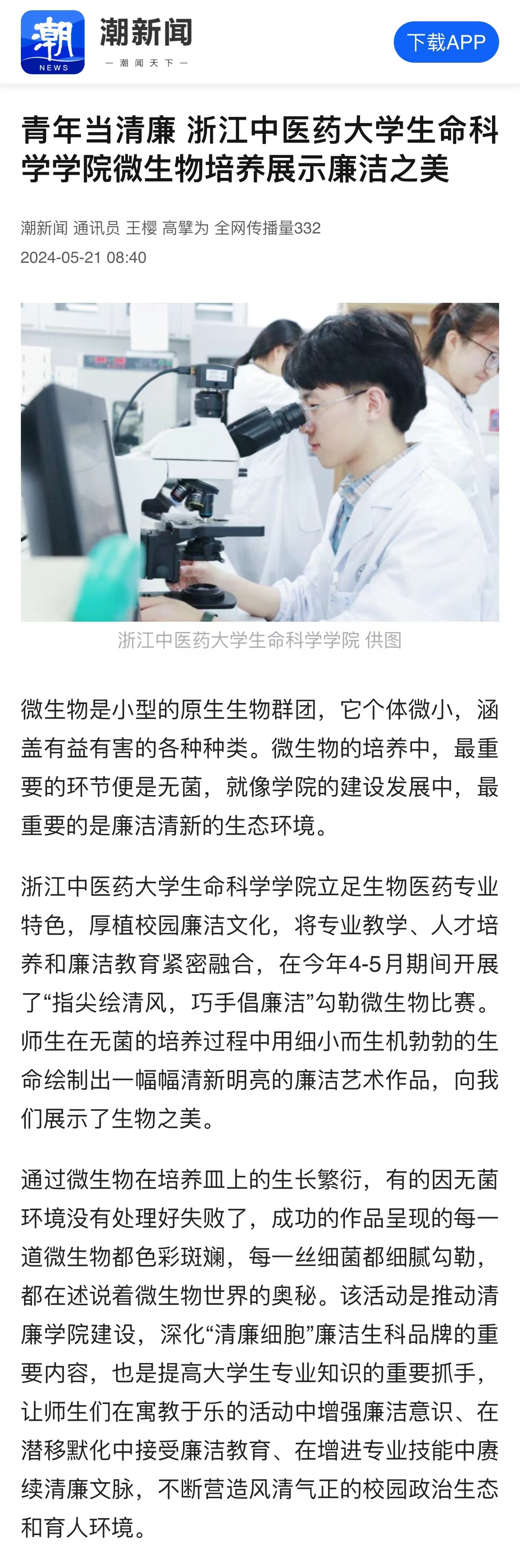 青年当清廉 浙江中医药大学生命科学学院微生物培养展示廉洁之美