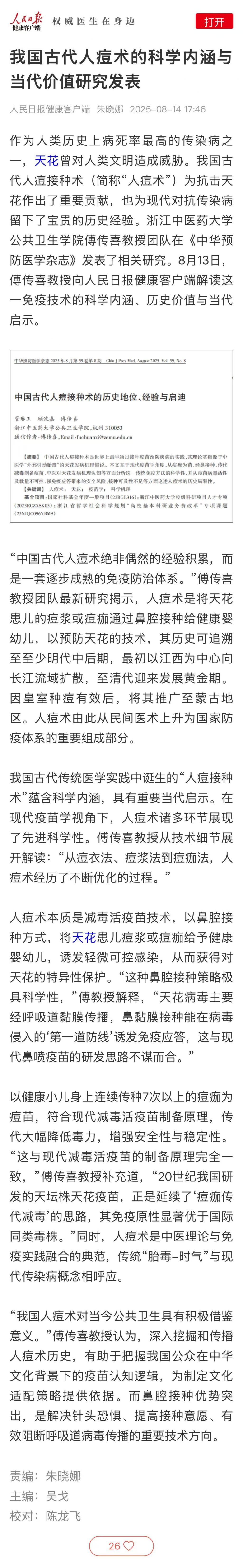 天花,这个曾夺走数亿生命的古老瘟疫,其免疫接种史的起点至少可追溯至中国明代。浙江中医药大学傅传喜教授团队在《中华预防医学杂志》近日发表的研究揭示:诞生于中国古代传统医学体系与预防实践中的“人痘接种术”是世界免疫接种的先驱,其科学原理与实践价值远超以往认知,并直接启发了西方发明的牛痘接种法。