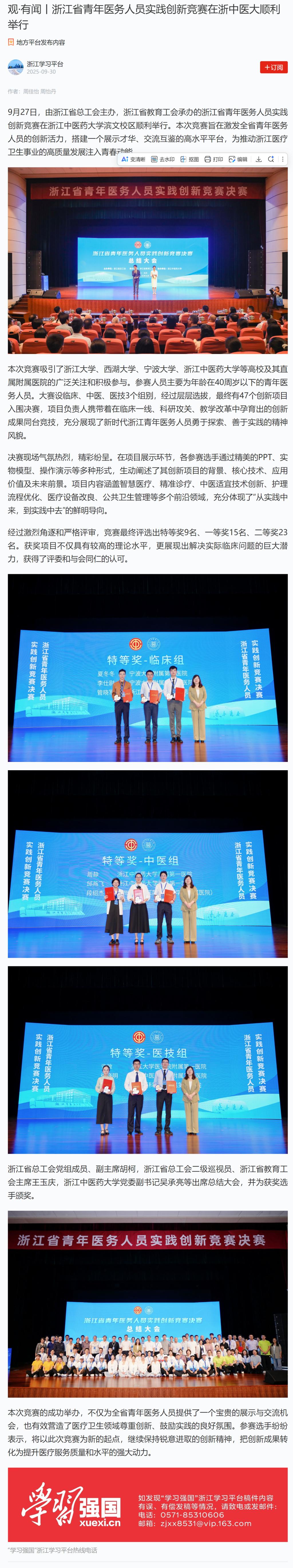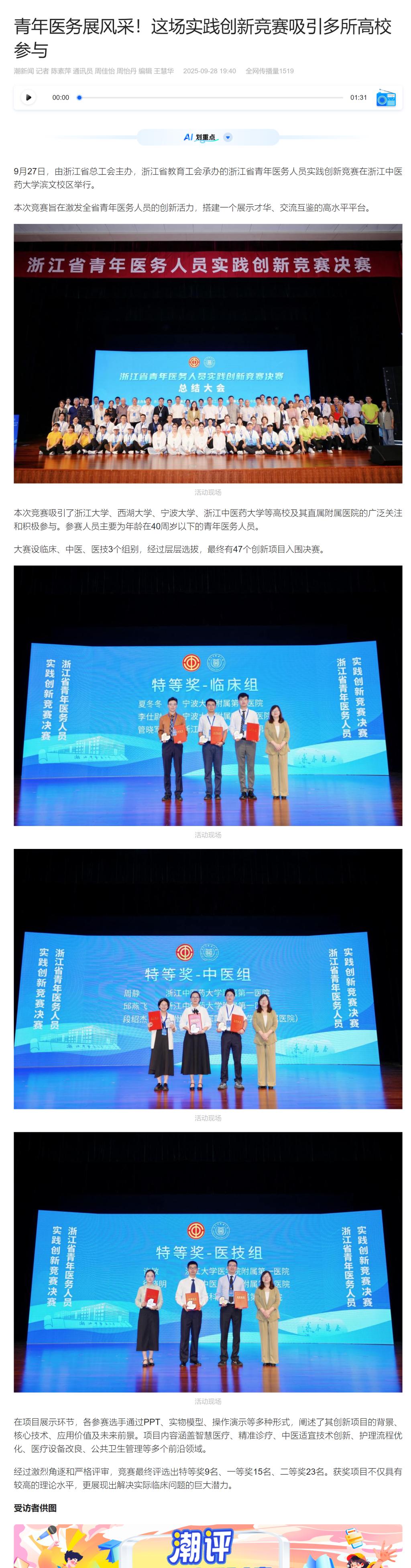 由浙江省总工会主办,浙江省教育工会承办的浙江省青年医务人员实践创新竞赛于9月27日在浙江中医药大学滨文校区举行。本次竞赛旨在激发全省青年医务人员的创新活力,搭建一个展示才华、交流互鉴的高水平平台,为推动我省医疗卫生事业的高质量发展注入青春动能。