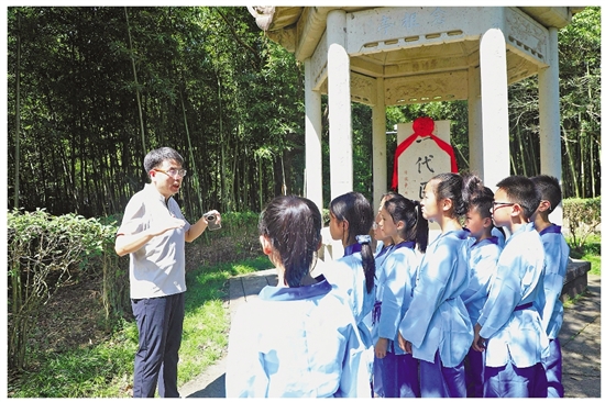 随后,义乌市中医院丹溪文化研究办公室主任成志俊带领“浙学少年团”参观丹溪文化园,结合园内的名医碑林、古籍复刻展品等,生动讲述朱丹溪“弃儒从医”“周游求艺”的生平故事、医学成就以及济世救命的医者仁心。