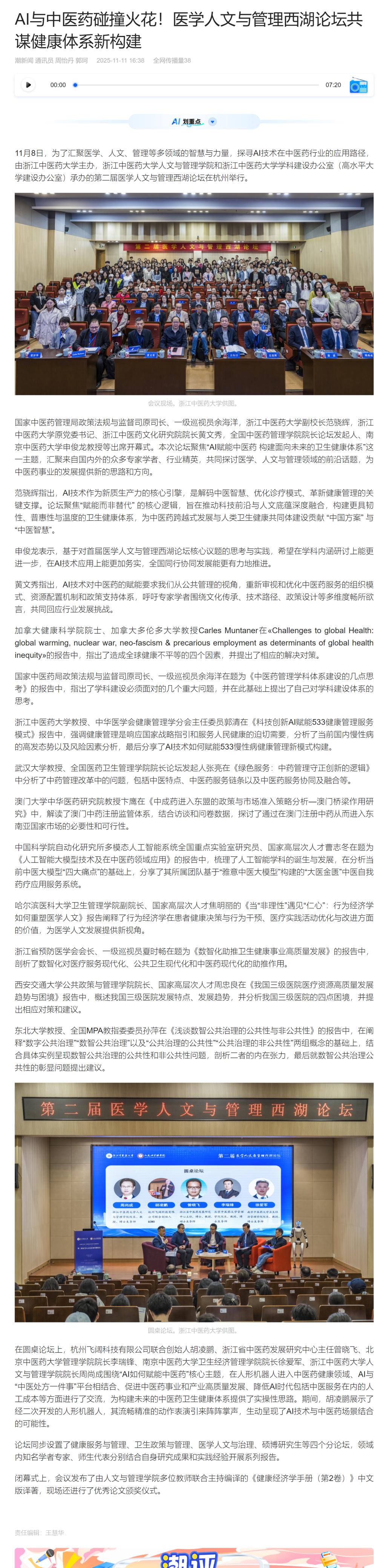 潮新闻:AI与中医药碰撞火花!医学人文与管理西湖论坛共谋健康体系新构建