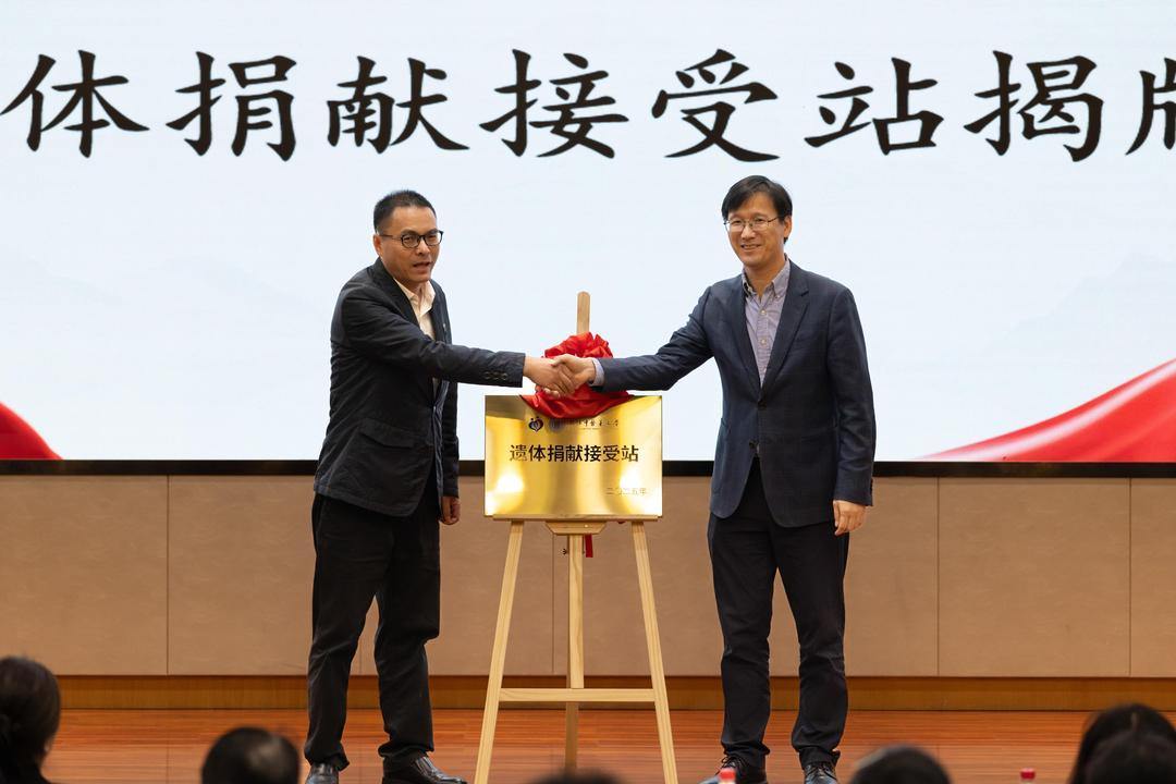 在全场师生的共同见证下,张孚传与黄建波为“浙江中医药大学遗体捐献接受站”揭牌,标志着学校在生命教育与医学实践融合方面迈出重要一步,也是学校为捐献者与医学生之间搭建传递爱心、延续生命桥梁的切实举措。