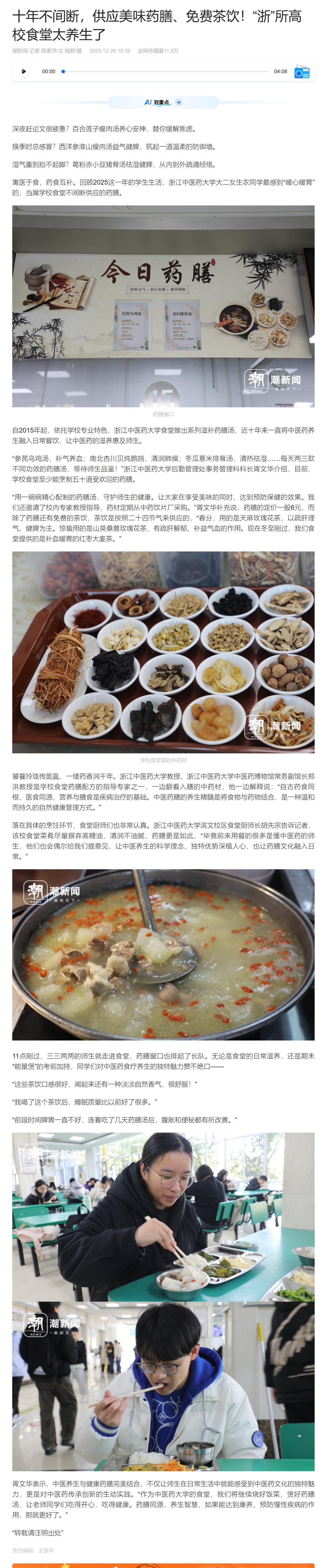 寓医于食,药食互补。回顾2025这一年的学生生活,浙江中医药大学大二女生农同学最感到“暖心暖胃”的,当属学校食堂不间断供应的药膳。