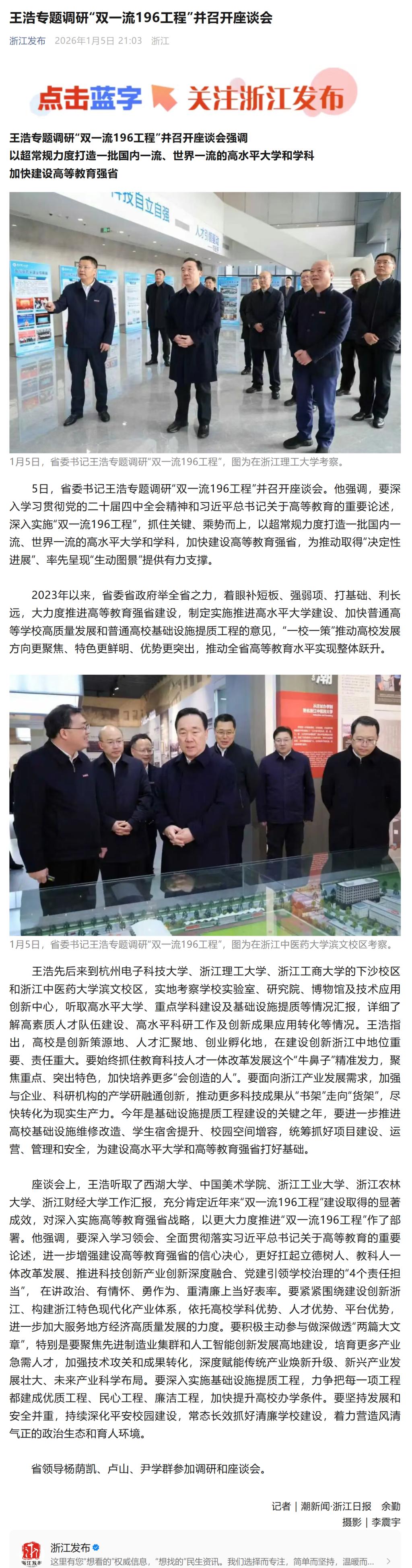 座谈会上,王浩听取了西湖大学、中国美术学院、浙江工业大学、浙江农林大学、浙江财经大学工作汇报,充分肯定近年来“双一流196工程”建设取得的显著成效,对深入实施高等教育强省战略,以更大力度推进“双一流196工程”作了部署。他强调,要深入学习领会、全面贯彻落实习近平总书记关于高等教育的重要论述,进一步增强建设高等教育强省的信心决心,更好扛起立德树人、教科人一体改革发展、推进科技创新产业创新深度融合、党建引领学校治理的“4个责任担当”, 在讲政治、有情怀、勇作为、重清廉上当好表率。要紧紧围绕建设创新浙江、构建浙江特色现代化产业体系,依托高校学科优势、人才优势、平台优势,进一步加大服务地方经济高质量发展的力度。要积极主动参与做深做透“两篇大文章”,特别是要聚焦先进制造业集群和人工智能创新发展高地建设,培育更多产业急需人才,加强技术攻关和成果转化,深度赋能传统产业焕新升级、新兴产业发展壮大、未来产业科学布局。要深入实施基础设施提质工程,力争把每一项工程都建成优质工程、民心工程、廉洁工程,加快提升高校办学条件。要坚持发展和安全并重,持续深化平安校园建设,常态长效抓好清廉学校建设,着力营造风清气正的政治生态和育人环境。