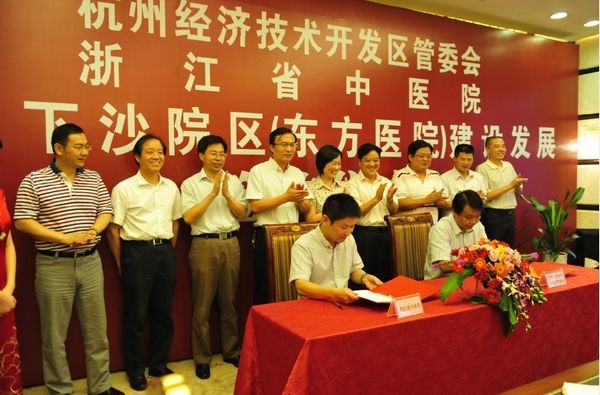 9月7日,杭州经济技术开发区管委会和附属一院就推进下沙院区(东方医院)建设发展事宜签订协议。杭州经济技术开发区管委会党工委书记盛成皿、主任陈晨、副书记俞建国、副主任何铨寿,浙江省卫生厅副厅长张平,浙江省中医药管理局局长徐伟伟,校党委书记孙秋华,校长范永升,党委副书记黄文秀、熊耀康,副校长李俊伟,纪委书记茹惠祥,省发改委、省财政厅、开发区各相关处室负责人和附属一院党政领导班子全体成员出席了签约仪式。仪式由开发区管委会党工委副书记俞建国主持。
