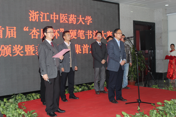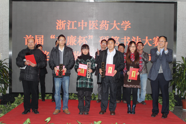 随后,大赛组委会秘书长、学工部副部长方年根宣读了本次大赛获奖名单,参会领导和嘉宾为获奖者颁奖。本次大赛一等奖获得者陈滨海、许文艳分别代表获奖师生发言。活动现场首发了《廉洁凝正气,硬笔书清风——浙江中医药大学首届“杏廉杯”硬笔书法大赛获奖作品集》,其中辑录学校领导题词8件、评委作品3件和获奖作品33件。