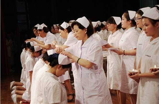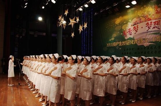 在庄严的加冕仪式上,随着神圣的《平安夜》钟声响起,274名2011级学生身着洁白的护士服,面带微笑,缓步走到了舞台中央。在悠扬的旋律中,行走、转身、授帽、接过前辈手中的红烛,而后庄严宣誓。