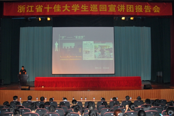 9月18日,浙江省十佳大学生巡回宣讲报告会在我校行政楼报告厅举行。中国美术学院学生孙国虎和浙江工业大学学生俞骋超作为浙江省第三届“十佳大学生”代表与我校师生分享了他们的成长经历和心路历程。校党委副书记黄文秀,省教育厅宣教处和学校宣传部、学工部、团委相关负责人出席了报告会。来自第一临床医学院、生命科学学院、外国语学院、听力与言语科学学院的600余名2013级新生聆听了报告会。