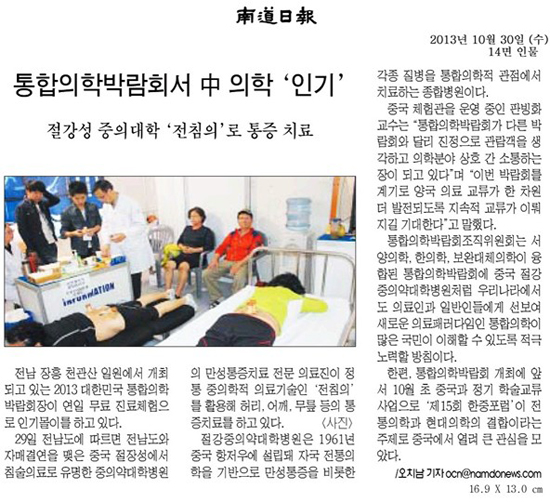 在所有参加博览会的医院中,我校附属第三医院医疗馆是最受欢迎、人气最高的,每天都需要工作人员向没有领到号的民众予以解释。超高人气的浙江馆也得到了媒体关注,全罗南道当地各大报纸都予以了报道。