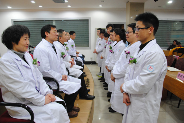 首批师承工作经遴选确定了12名指导老师和14名师承学生,分别来自于外科、骨伤科、针灸科、推拿科、西医内科和中医内科5个专业。会上,指导老师和学生签订了师承协议书,14名学生虔诚地向师傅们鞠躬、敬茶,并与师傅合影留念。指导老师代表和师承学生代表分别作了发言。