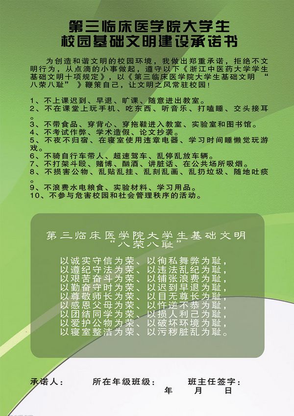 11月,第三临床医学院开展了“大学——为何而学?”学风建设主题团日活动。各团支部在班主任的带领下,以观看微视频、辩论赛、主题演讲等多种形式,通过思辨、讨论、个人承诺的方式,将学校关于认真抓好校园基础文明建设的具体要求传达到每位同学。同时学院还希望通过此次学风建设主题团日活动,将该院提出的大学生基础文明“八荣八耻”内化为学生自我提升、自我发展的需要,在全院上下逐步形成积极向上、自觉文明的优良学风。