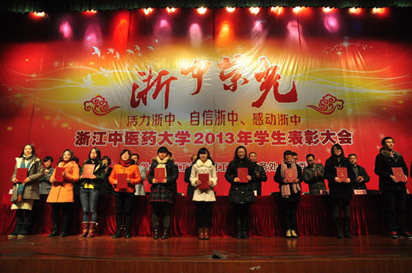 会议表彰了国家奖学金、国家励志奖学金、浙江省康恩贝自强奖学金、李大鹏中医药奖学金、三好学生、优秀学生干部、优秀学生奖学金、先进班集体、文明寝室等各类奖项共计20余项。颁奖仪式后,校先进班集体代表周洁琳及国家奖学金代表李凯程分别作为先进集体和先进个人代表发言。