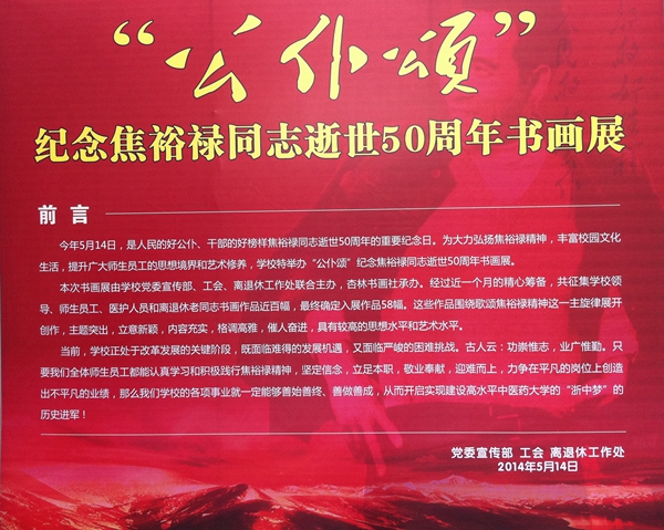 本次书画展由党委宣传部、工会、离退休工作处联合主办,杏林书画社承办。经过近一个月的精心筹备,共征集学校领导、师生员工、医护人员和离退休老同志书画作品近百幅,最终确定入展作品58幅。这些作品围绕歌颂焦裕禄精神这一主旋律展开创作,主题突出,立意新颖,内容充实,催人奋进。