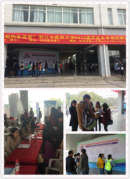 11月19日,我校就业指导中心联合杭州滨江区高新人才中心在18号楼一楼举办了“牵手大学生 相约在高新”浙江中医药大学2015届毕业生专场招聘会。赛诺菲、施强、民生药业、迪安诊断、中南建设等60余家用人单位走进我校,为临床医学、药学、中药学、计算机、医学检验、生物技术、食品、市场营销、英语等专业的毕业生提供了1000余个就业岗位。1200多名应届毕业生参加了招聘会,约254人与用人单位达成初步意向。招聘会还吸引了不少低年级的同学到场观摩。