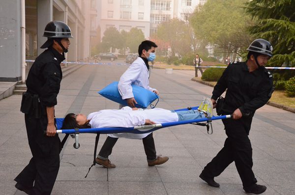 随着滚滚浓烟升起,警报声响彻校园上空,警戒组、疏散组、灭火组、救援组迅速到位。“火灾”现场人员第一时间向校园110报警中心报警,学校突发事件紧急预案快速启动。在应急领导小组指挥下,按照人员安全第一、抑制火情扩散的原则,警戒组立即设置警戒线,控制各出入口并保护现场;疏散组引导各楼层不同方位的教师、学生、工作人员沿就近逃生路线向安全疏散口迅速撤离,保持正确的逃生姿势并避免因惊慌而发生踩踏事故;灭火组穿戴防护装备携灭火器、消防水带等赶赴事故现场模拟救火过程;救援组抬着担架进入火场,从浓烟中成功救出伤员。各小组行动迅速,严格按照演练方案有条不紊地进行,15分钟之内完成了全部演练任务。