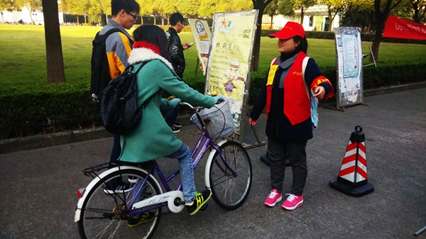 从11月中旬开始,医学技术学院2014级听力与言语康复学2班全体同学以志愿者身份参与校园交通秩序维护工作,每天在学校交通主干道上引导同学们按要求有序停放自行车。