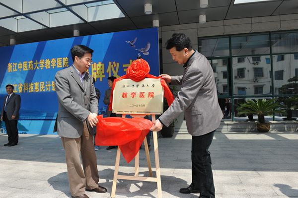 12日,我校与兰溪市中医医院在兰溪举办共建教学医院关系揭牌暨签约仪式。校长范永升、副校长李俊伟,金华市卫计委副主任周国彪,兰溪市委书记吴国成、市长朱瑞俊以及卫生局、中医院等单位相关人员参加了签约仪式。范永升校长与吴国成共同为教学医院揭牌。