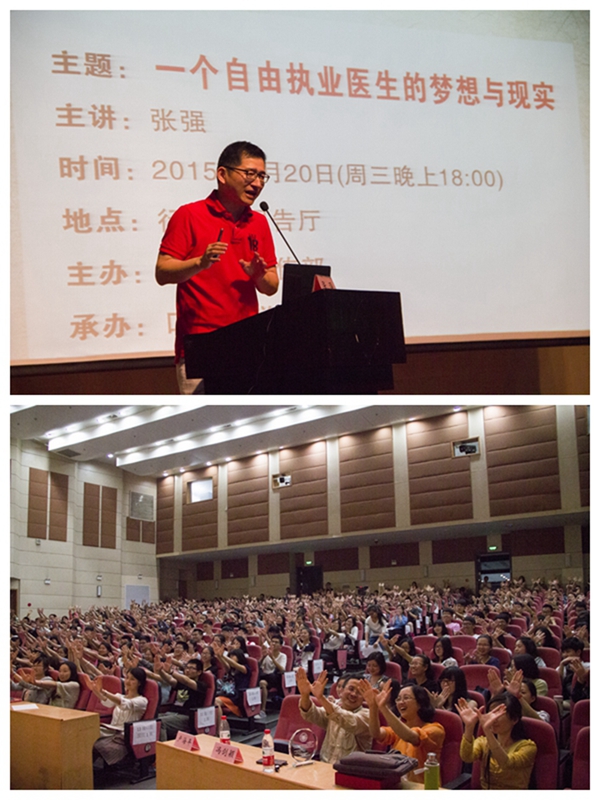 讲座中,张强医生以开放式提问的形式,将现场600余名师生感兴趣的问题和疑惑串联成一个个小故事,讲述了他如何选择专业、在专业技术中孜孜以求以及离开传统医疗体制创办张强医生集团的经历。他鼓励同学们大胆追求自己的梦想。