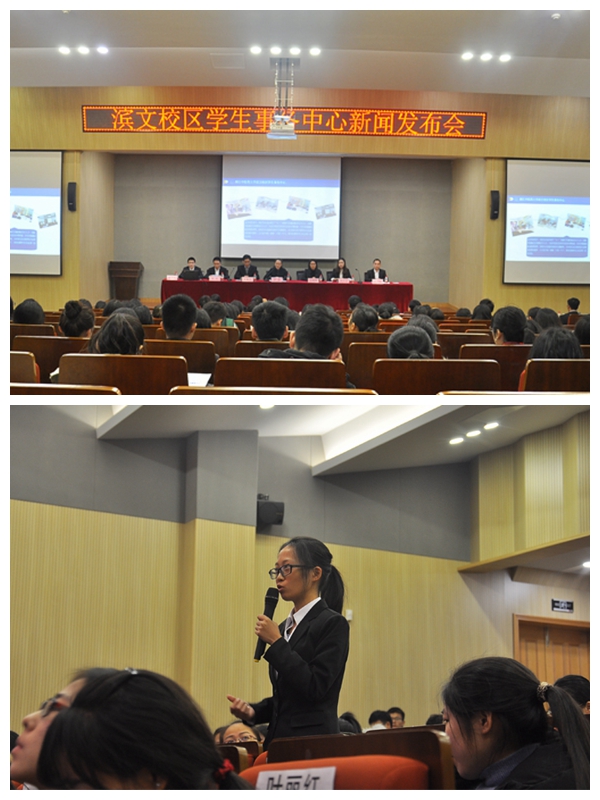 12月6日中午,我校滨文校区学生事务中心举行新闻发布会,介绍中心服务宗旨、工作理念、组织架构、部门职能及网上办事大厅建设目标,并就中心成立3个月来在协调处理相关部门工作、扎实开展学风督查和寝室文明建设、大力提升学生事务处理信息化水平等方面做出的努力和取得的成绩进行通报。各学院学生代表180余人参加发布会。