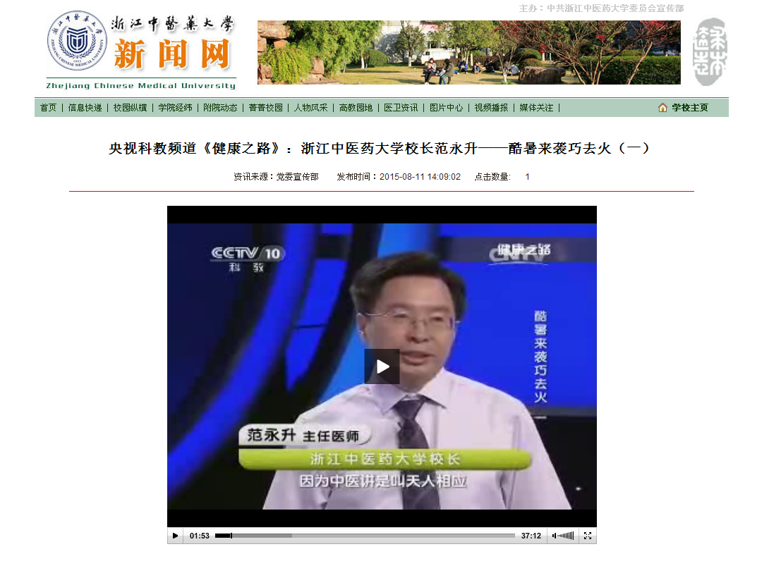 自8 月10日至13日,晚上18:11起,央视科教频道《健康之路》栏目,围绕口腔溃疡、口臭、咽痛、鼻出血等上火的病症,连续四天,每晚一集,播出由我校校长范永升教授参与录制的“酷暑来袭巧去火”的节目。师生可通过官方微信、微博、新闻网《视频播报》栏目同步关注。http://news.zcmu.edu.cn/shiping/143927334224687469.html