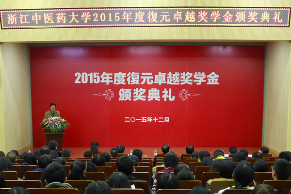 12月25日下午,2015年度“復元卓越奖学金”颁奖典礼在滨文校区图书馆报告厅隆重举行。浙江义乌復元私立医院法人代表王福元先生、副总裁方慧兰女士、院长陈伟民先生,我校党委副书记陈刚、副校长李俊伟,党委学工部、研工部、教务处负责人,復元卓越奖学金评审委员会委员出席颁奖典礼并为获奖学生颁奖。各学院分管学生工作负责人、全体获奖学生200余人参加颁奖典礼。