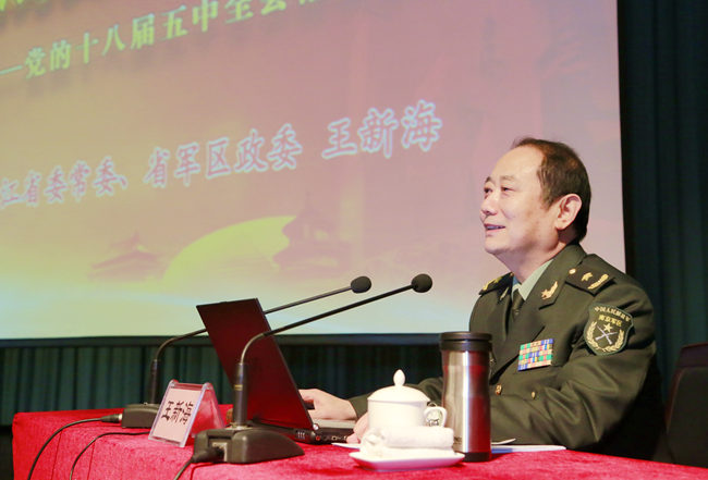 12月31日上午,省委常委、省军区政委王新海少将在我校滨文校区行政楼报告厅为师生传达党的十八届五中全会和省委十三届八次全会精神。