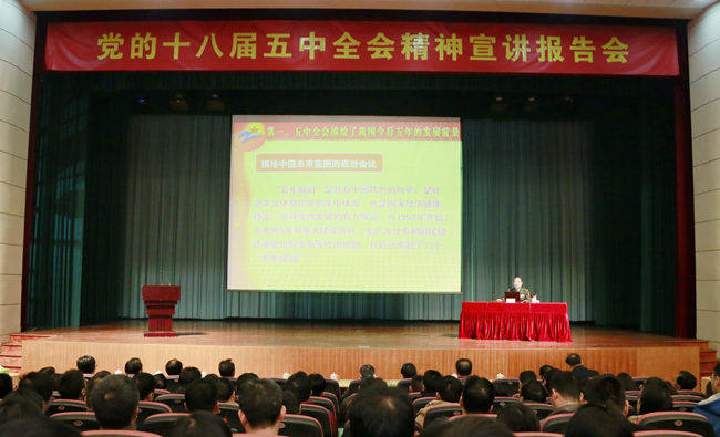 王新海在报告中对党的十八届五中全会精神作了高屋建瓴的阐释。他说,十月底闭幕的党的十八届五中全会,是我国深化改革进入关键阶段召开的一次关键会议,在我国经济社会发展史上具有里程碑意义。这是一次描绘了中国未来蓝图的会议,是一次跨越“中等收入陷阱”的关键会议,是一次冲刺全面建成小康的动员会议。会议通过的《建议》首次把“四个全面”战略布局写入中央全会,对全面建成小康社会的构成目标进行了更清晰、更系统、更全面的阐述,提出了“创新、协调、绿色、开放、共享”五大发展理念,提出了“培育发展新动力”、“拓展发展新空间”、“深入实施创新驱动发展战略”、“大力推进农业现代化”、“构建产业新体系”、“构建发展新体制”、“创新和完善宏观调控方式”等七项创新举措,从“增加公共服务供给”、“实施脱贫攻坚工程”、“提高教育质量”、“促进就业创业”、“缩小收入差距”、“完善社会保障制度”、“推进健康中国建设”、“促进人口均衡发展”等八个方面做出具体部署,并单辟一章以大篇幅就“加强和改善党的领导”作详细部署,突出强调了党的领导是中国特色社会主义制度的最大优势,是实现经济社会持续健康发展的根本政治保证。