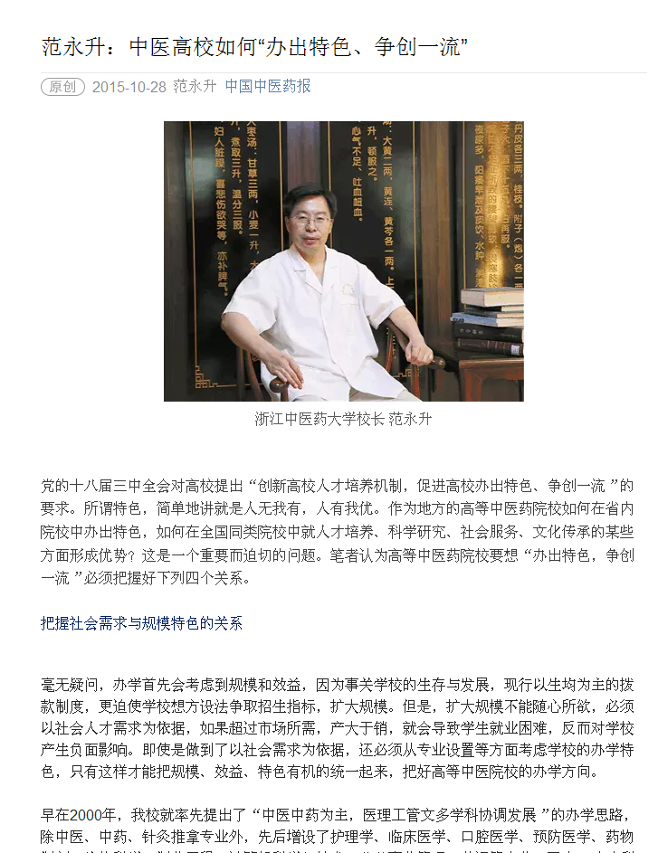 我校范永升校长在《中国中医药报》10月28日第三版发表文章,认为高等中医药院校要想“办出特色,争创一流”必须把握好下列四个关系。一是把握社会需求与规模特色的关系,二是把握科学研究与学科建设的关系,三是把握中医文化与育人的关系,四是把握机遇与发展的关系。请点击链接阅读全文。