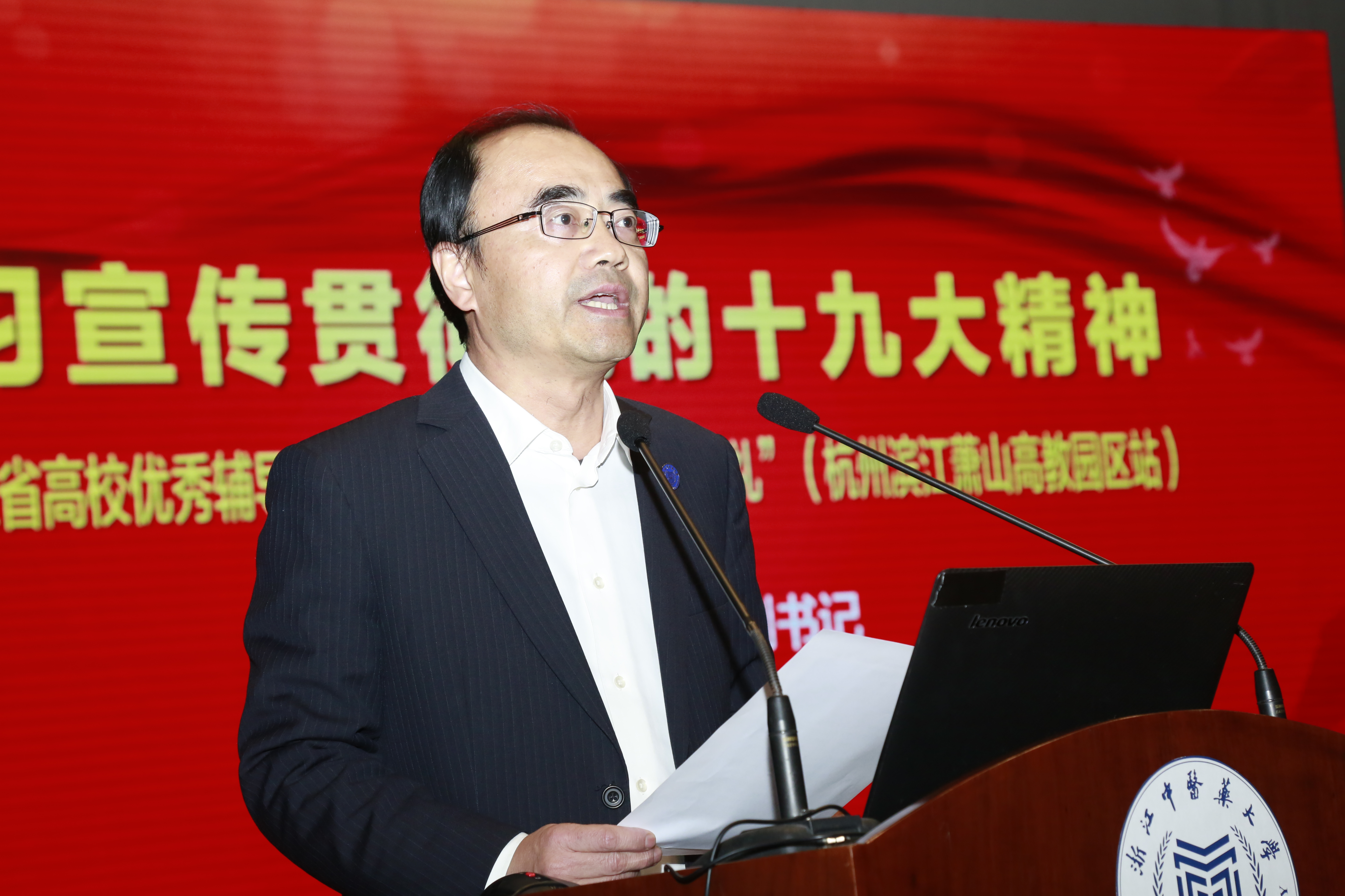 12月12日下午,为进一步推进党的十九大精神学习宣传全覆盖,引导广大青年学生自主自觉用习近平新时代中国特色社会主义思想武装头脑,牢记历史使命,书写人生华章。由中共浙江省委教育工作委员会主办的学习宣传贯彻党的十九大精神——浙江省高校优秀辅导员“校园巡讲”和“网络巡礼”活动第二场杭州滨江萧山高教园区分站巡讲在浙江中医药大学滨文校区行政楼报告厅举行。
