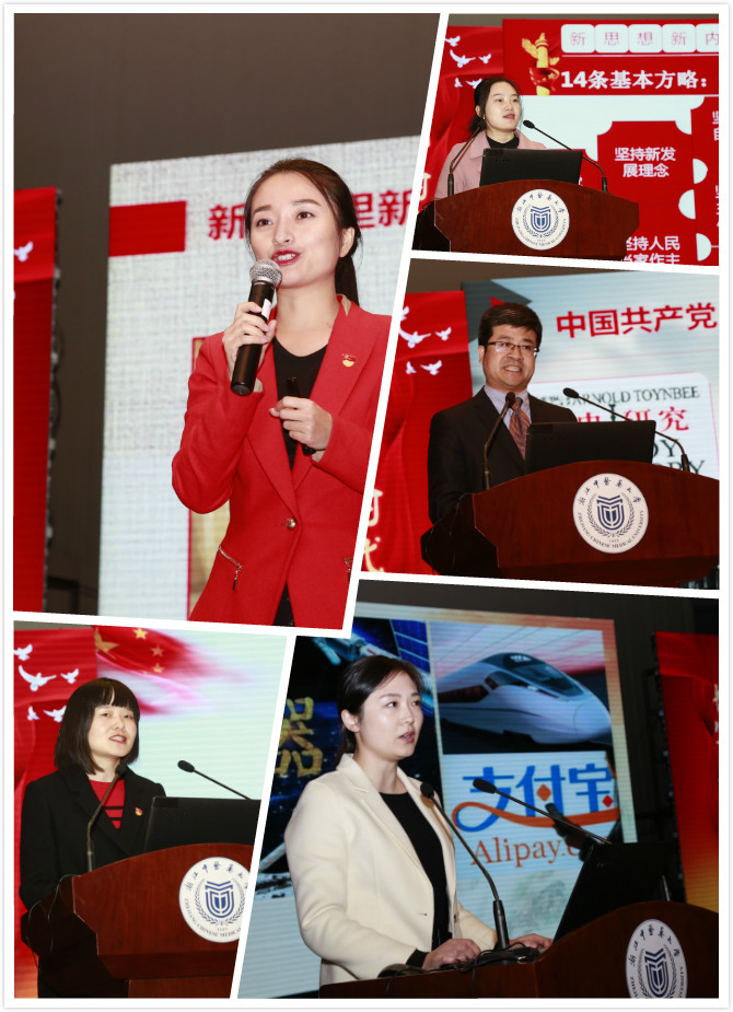 随后,五位高校优秀辅导员代表依次做报告。浙江大学辅导员邵頔作题为《新时代里新矛盾,新征程中新方向》的报告,她指出,“重新定义社会主要矛盾,是对社会变迁的把握,但归根结底是对人民向往的回应。紧扣新矛盾,瞄准新目标,踏上新征程,无愧新时代。扬起红船的风帆,也许前方有风浪,但我们坚信,只要万众一心,终能披乘风破浪,到达远方。” 浙江理工大学辅导员王惠燕作题为《新时代,新思想,新作为》的报告,她呼吁青年学子:“追寻习近平新时代中国特色社会主义思想的火炬,携手照亮一个民族走向富强的历程;感受思想的光芒,共同谱写改变中国、影响世界的新华章!”浙江师范大学辅导员施佳作题为《实现伟大梦想,高水平谱写浙江新篇章》的报告,他对“改革开放近四十年来,我们党绘就了经济总量高位跃升的‘中国轨迹’,创造了人民生活水平大幅跨越的‘中国奇迹’,不断书写着破解种种改革发展难题的‘中国答卷’,极大彰显了中国特色社会主义的伟大力量”感到无比自信。浙江中医药大学辅导员孙文菁作题为《不忘初心跟党走,牢记使命勇担当》的报告,她认为:“今天的中国、中国人已经不一样了。5年来,中国奇迹震撼了世界!5年来,中国共产党开启自我革命,堪称再塑!”。浙江旅游职业学院辅导员徐峥作题为《新时代、新青年——风起扬帆正当时》的报告,她以习近平总书记对青年的寄语互相勉励,“‘青年有着大好机遇,关键是要迈稳步子、夯实根基、久久为功。’鼓励大家‘静下来多读经典,多知其所以然’,青年要在‘实干’、‘韧劲’两个方面下功夫,立足实际,埋头苦干,勤奋耕耘,在一点一滴的知识积累、本领长进中施展才华、实现梦想”。