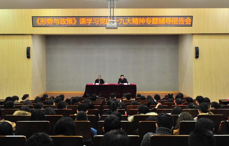 与此同时,省社科联副主席陈先春在滨文校区图书馆报告厅主会场,为我校全体学生作《形势与政策》课学习党的十九大精神专题辅导讲座,各教室分会场同步直播。