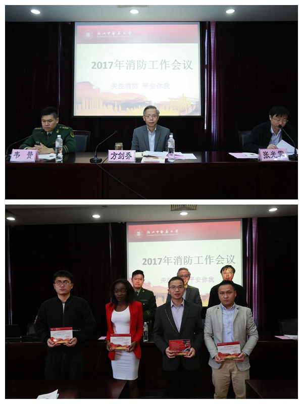 11月9日上午,我校消防安全工作会议在滨文校区第一会议室召开。校长方剑乔、副校长张光霁、滨江消防大队参谋韦赞出席会议,各单位消防责任人、兼职消防员和义务消防志愿者代表100余人参加会议。会议由张光霁副校长主持。