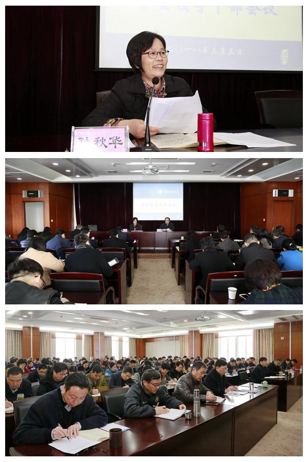 最后,孙秋华书记围绕知、行、效3个字作了总结讲话。她指出,2018年是全面贯彻十九大精神的开局之年,是实施“十三五”规划承上启下的关键一年以及实施省部共建、全面推进重点高校建设的开启之年,也是改革开放40周年,做好2018年的工作对于学校“十三五”乃至今后的发展具有重要的意义。面对新形势、新机遇、新挑战、新任务、新要求,孙秋华书记对全校干部提出了四点要求:一是必须凝聚共识,切实增强责任担当意识。要正确认知重点建设高校及省部共建高校肩负的使命,正确认知与比对标杆的差距以及困难问题,正确认知学科和专业建设面临的任务和挑战,正确认知二级班子的努力方向、奋斗目标、肩负责任,正确认知个体的岗位胜任度以及能力素质现状,正确认知谋发展、带队伍该有的行动与策略。二是必须增强自觉,着力提升重点高校建设的行动力。从学科建设、人才培养、社会服务、人才队伍建设、国际交流合作、机制改革保障6个方面寻求突破。三是必须强化执行,不断增强干事创业的本领。要加强顶层设计、注重调查研究、寻求科学方法、遵循把握规律、敢抓善抓真抓、聚力攻坚克难。四是必须讲政治顾大局,以务实作风立足岗位做贡献。要讲政治、讲学习、讲大局、讲务实、讲本领、讲境界。孙秋华书记希望全校各部门、各学院、各单位要将今天会议精神传达到每个教职员工;要深入研究贯彻落实会议部署的各项工作任务;要转变观念、凝聚共识、增强责任、明确任务、共同奋斗,为学校美好明天做出贡献。