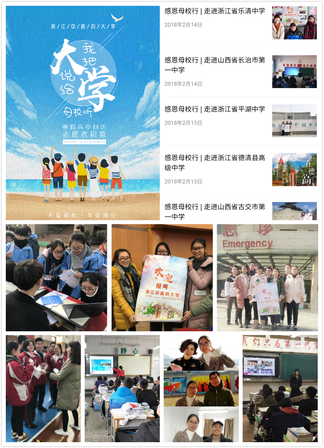 2018年寒假期间,学生处组织学生开展了“感恩母校行——我把大学说给母校听”回访高中活动。通过志愿者招募、遴选、培训,选拔了260余名学生回乡参加活动。活动期间共回访60所中学,其中省内中学49所、省外中学11所。活动受到高中师生的支持与好评。