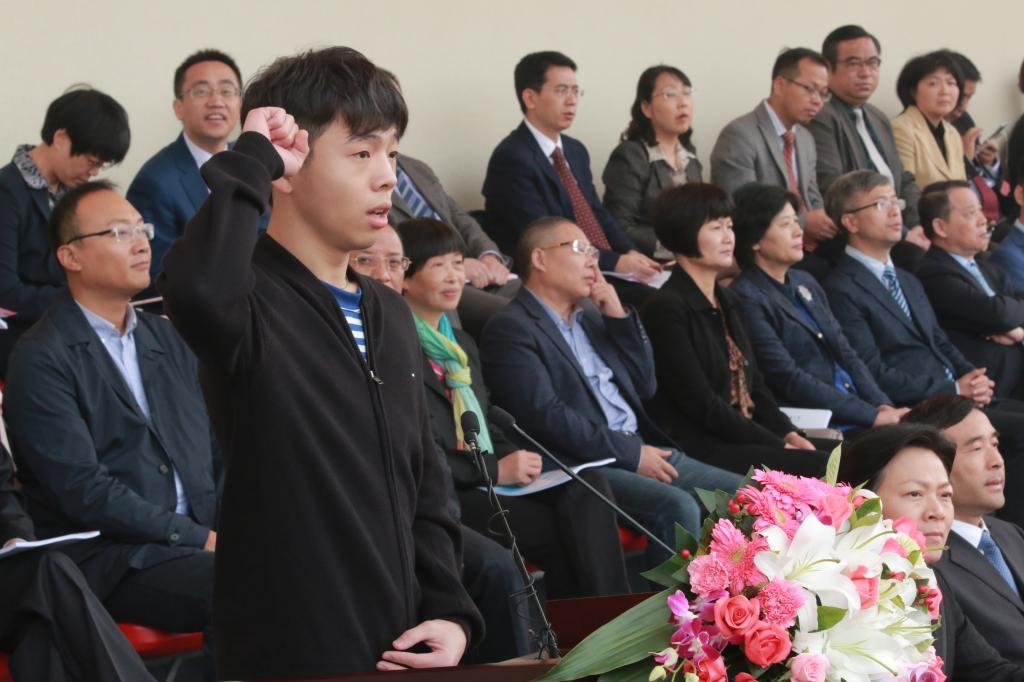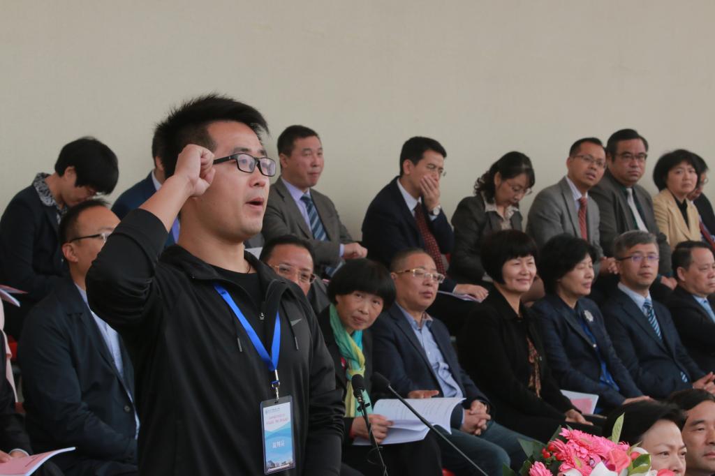 为弘扬体育精神,展现我校学子的运动竞技风尚,运动员代表周正祥、裁判员代表韩政老师上台宣誓。