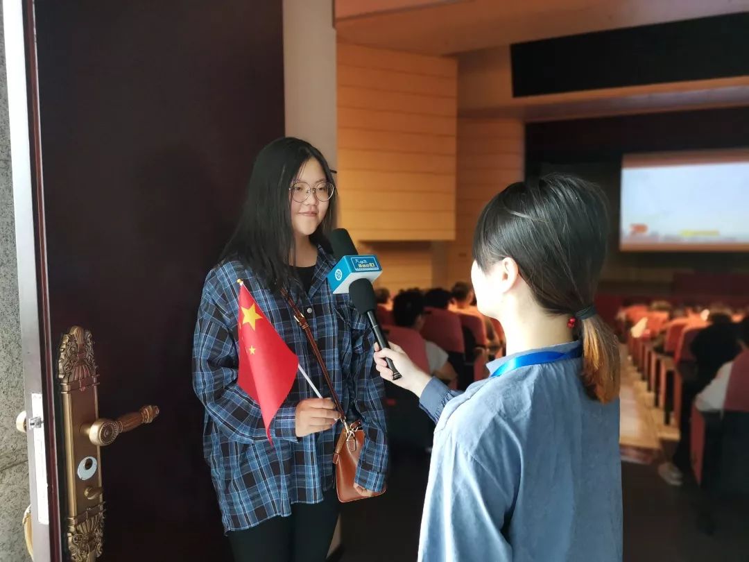▲ 学生记者现场采访观看直播的学生