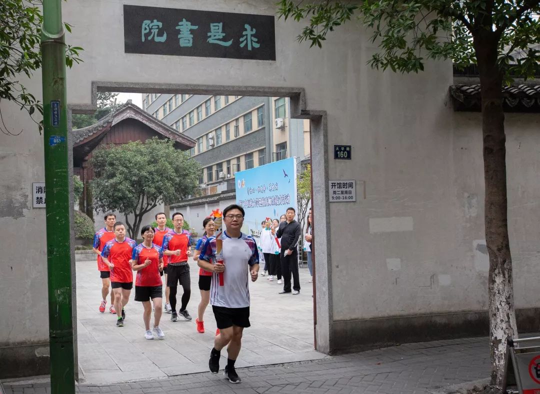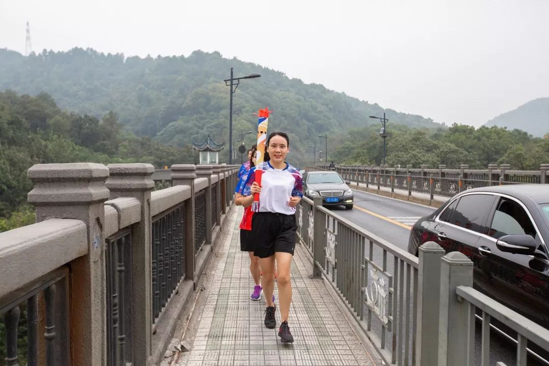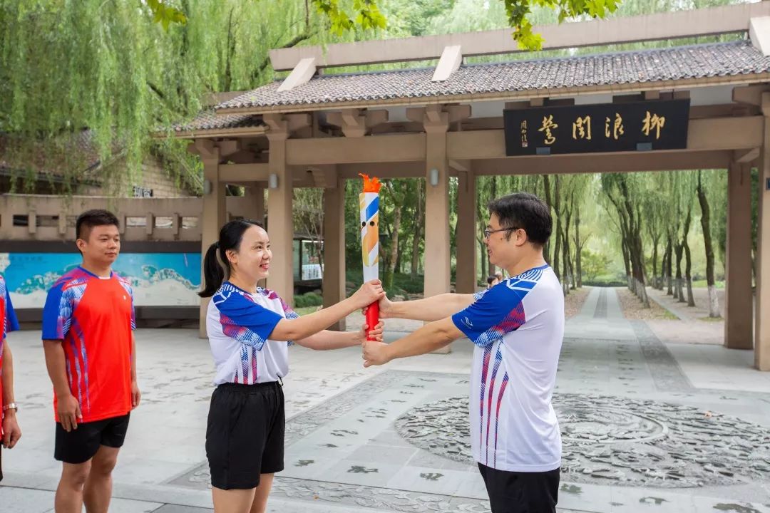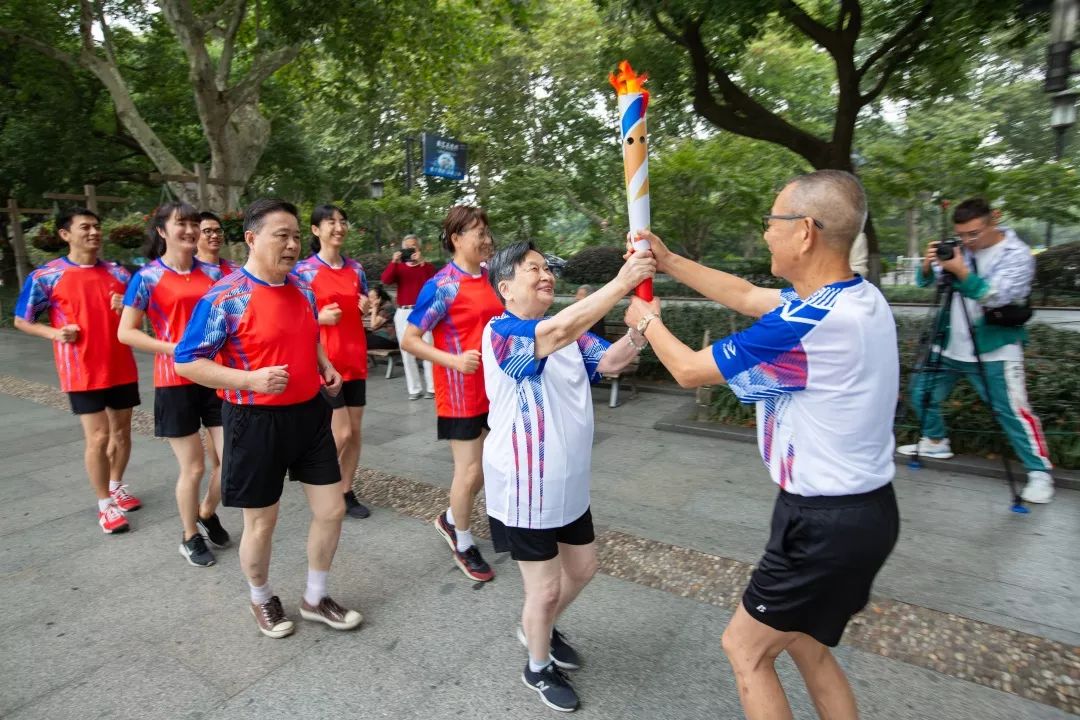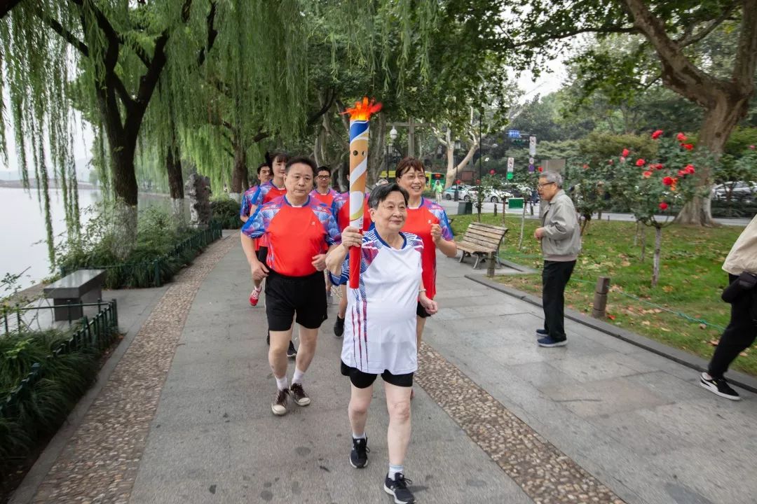 在西湖边,火炬传递给了离退休同志代表寿桂贤,一路传递到求是学院。