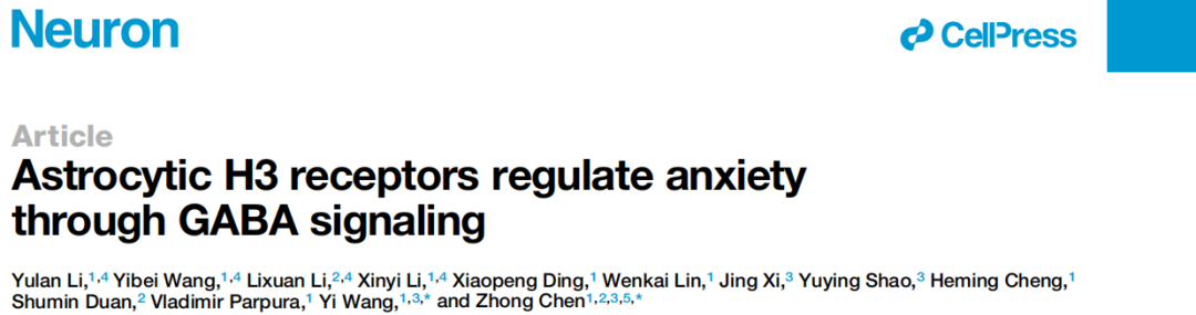 近日,我校陈忠教授、汪仪研究员团队在国际知名期刊《Neuron》发表了题为“Astrocytic H3 receptors regulate anxiety through GABA signaling”的研究论文。该研究揭示了大脑中组胺能信号通过星形胶质细胞H3受体促进胶质递质GABA释放,进而“内源性缓解”焦虑行为的神经环路与细胞分子机制。研究揭示了焦虑发生的新机制,并有望为焦虑障碍的治疗提供潜在新靶点。