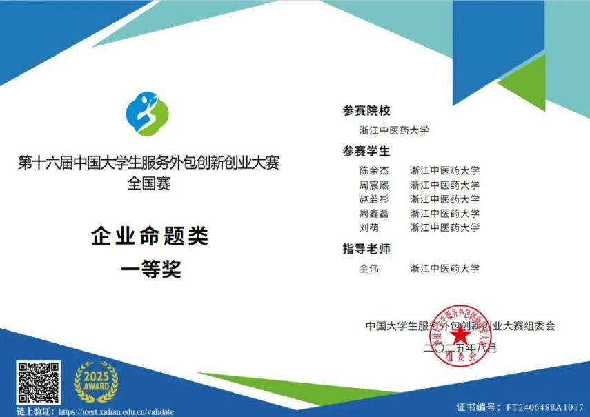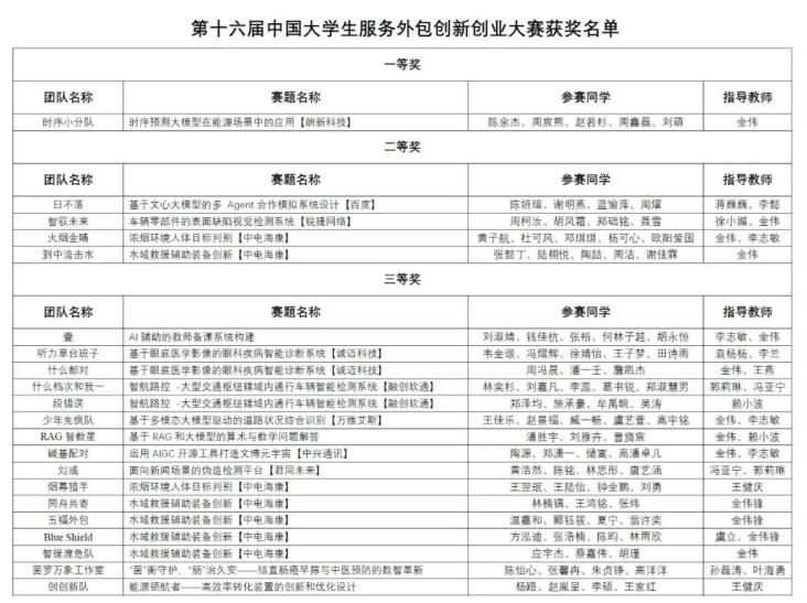 在日前结束的第十六届中国大学生服务外包与创新创业大赛全国总决赛中,我校再获佳绩,取得国家级一等奖1项,二等奖4项,三等奖16项的好成绩,连续两年获得国家级一等奖,获奖总数再创新高。其中,我院数据科学与大数据专业陈余杰同学团队获国家级一等奖1项,这也是我院学子在这项赛事中第二次斩获国家级一等奖。我院学生团队还获得二等奖3项,三等奖8项。