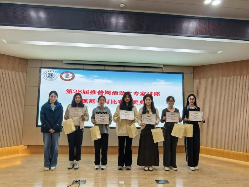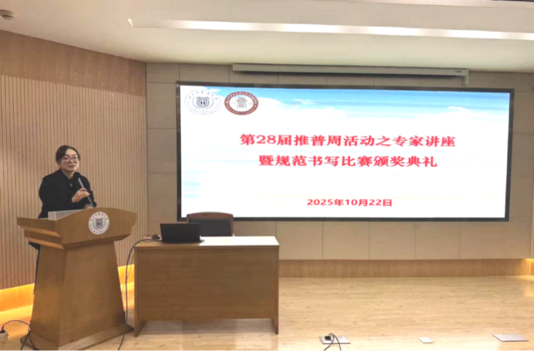 10月22日,我校第28届推广普通话宣传周活动之专家讲座暨“书汤头经典,传岐黄正音”规范书写比赛颁奖典礼在滨文校区23101教室顺利举行。浙江工商大学教授王晓华、浙江中医药大学教务处副处长季旭明、团委副书记钱乃婧以及全校师生代表出席活动,人文与管理学院副院长张红霞担任主持。