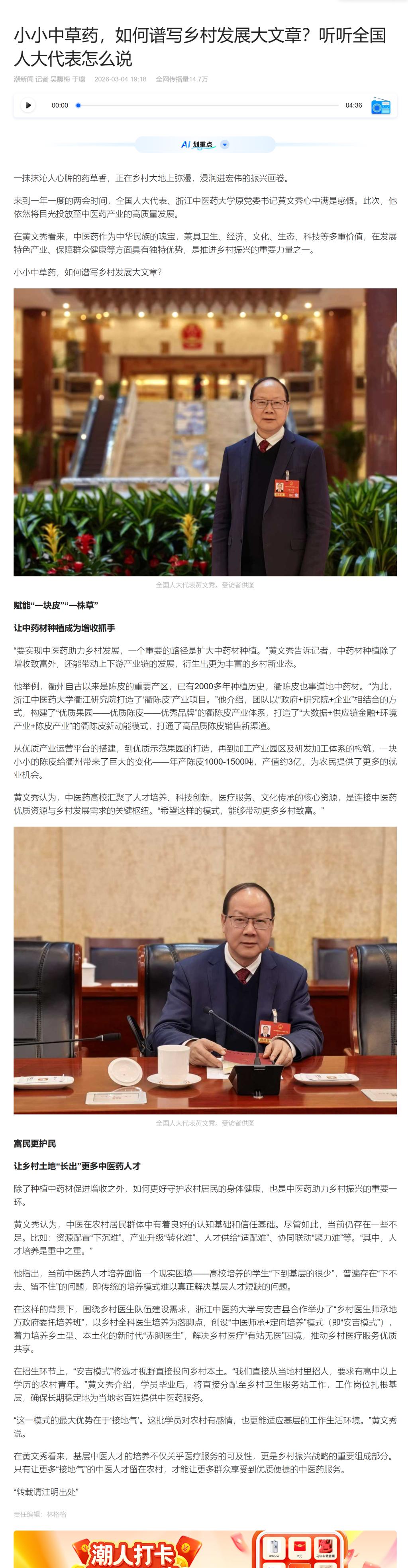 黄文秀认为,中医药高校汇聚了人才培养、科技创新、医疗服务、文化传承的核心资源,是连接中医药优质资源与乡村发展需求的关键枢纽。“希望这样的模式,能够带动更多乡村致富。”